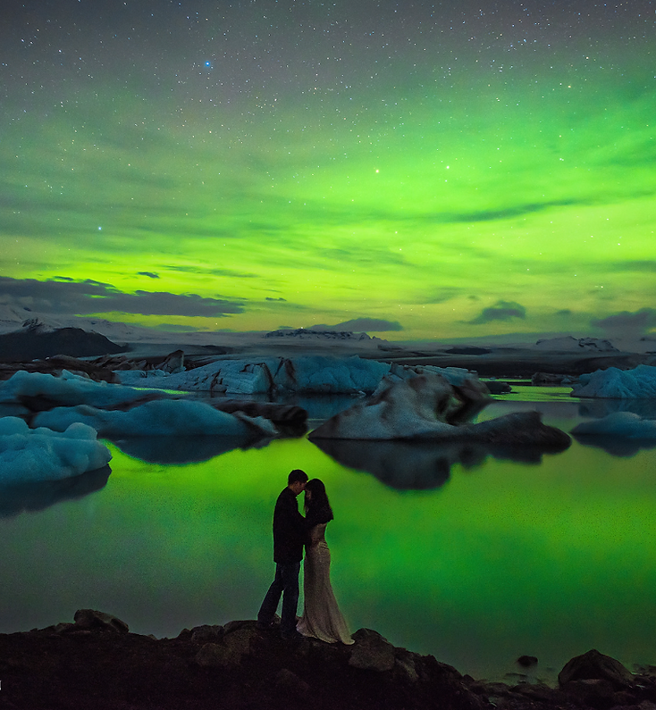With its dramatic landscapes of ice and fire, Iceland offers a stunning backdrop for the Northern Lights. Prime viewing spots include Thingvellir National Park and the Jokulsarlon Glacier Lagoon. Iceland’s diverse terrain, from volcanic deserts to glacial lagoons, provides an array of otherworldly settings for your special day.